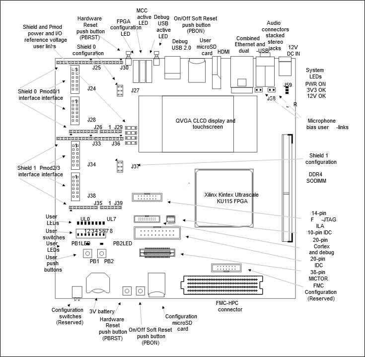 The MPS3 board contains a Xilinx Kintex Ultrascale XCKU115-1FLVB1760C FPGA, support logic, and peripheral interfaces that provide access to the FPGA and I/O interfaces.